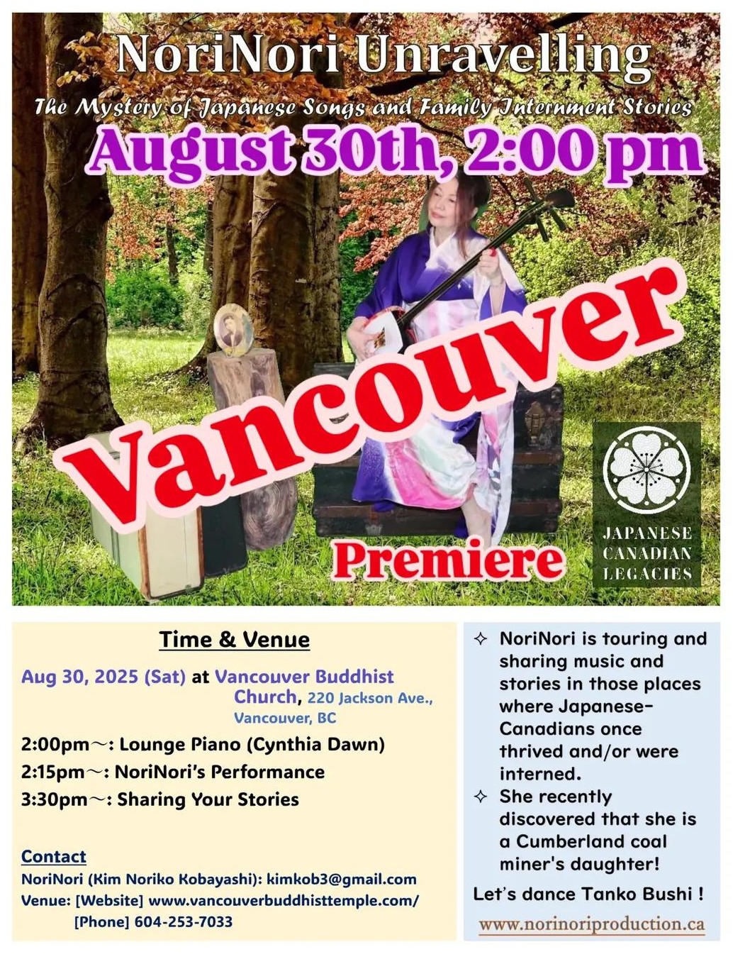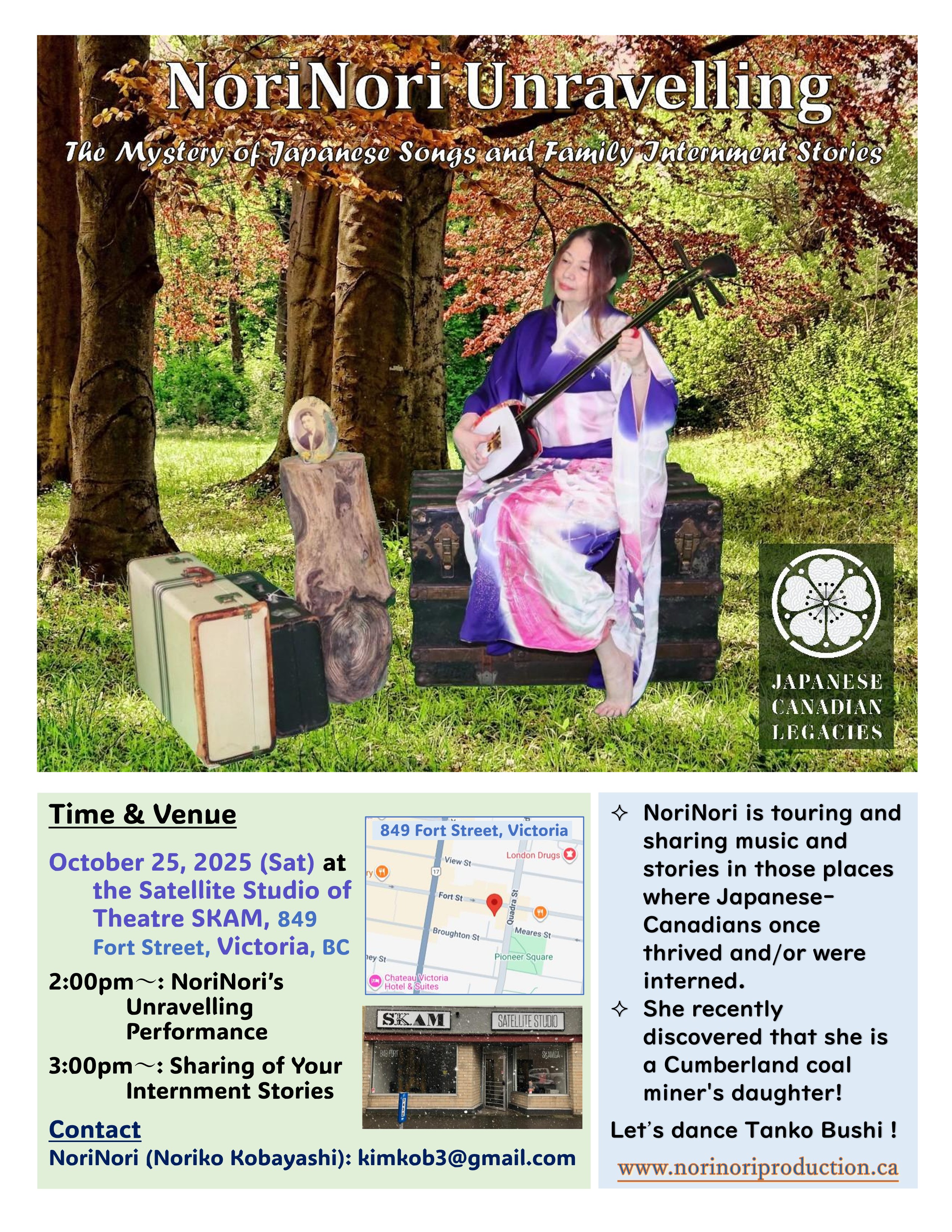 "NoriNori Unravelling the Mystery of Japanese Songs and Family Forced Internment" original music and some traditional rearrangements are online now. I am touring and sharing music and stories in those places where Japanese-Canadians once thrived and/or were interned. I will be spending a bit more time in Cumberland, as I recently discovered that I am a Cumberland coal miner's daughter! I have stories to tell.....