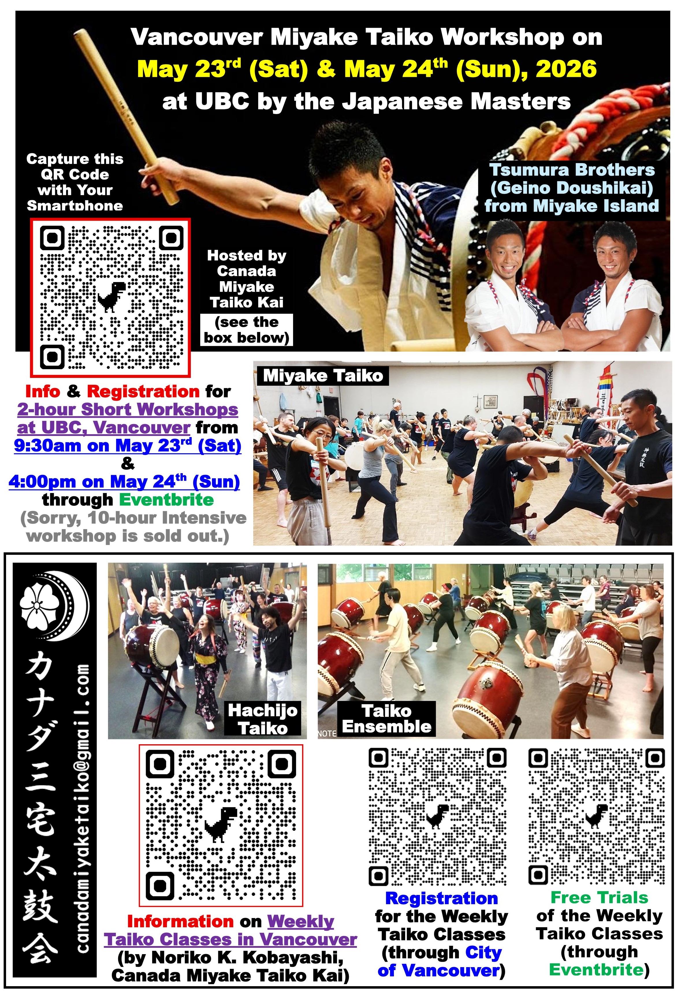 https://www.eventbrite.ca/e/vancouver-miyake-taiko-workshop-registration-838372975137Miyake Workshop with the Tsumura brothers of Miyake Jima Geino Doshi Kai. https://www.eventbrite.ca/e/vancouver-miyake-taiko-workshop-registration-838372975137